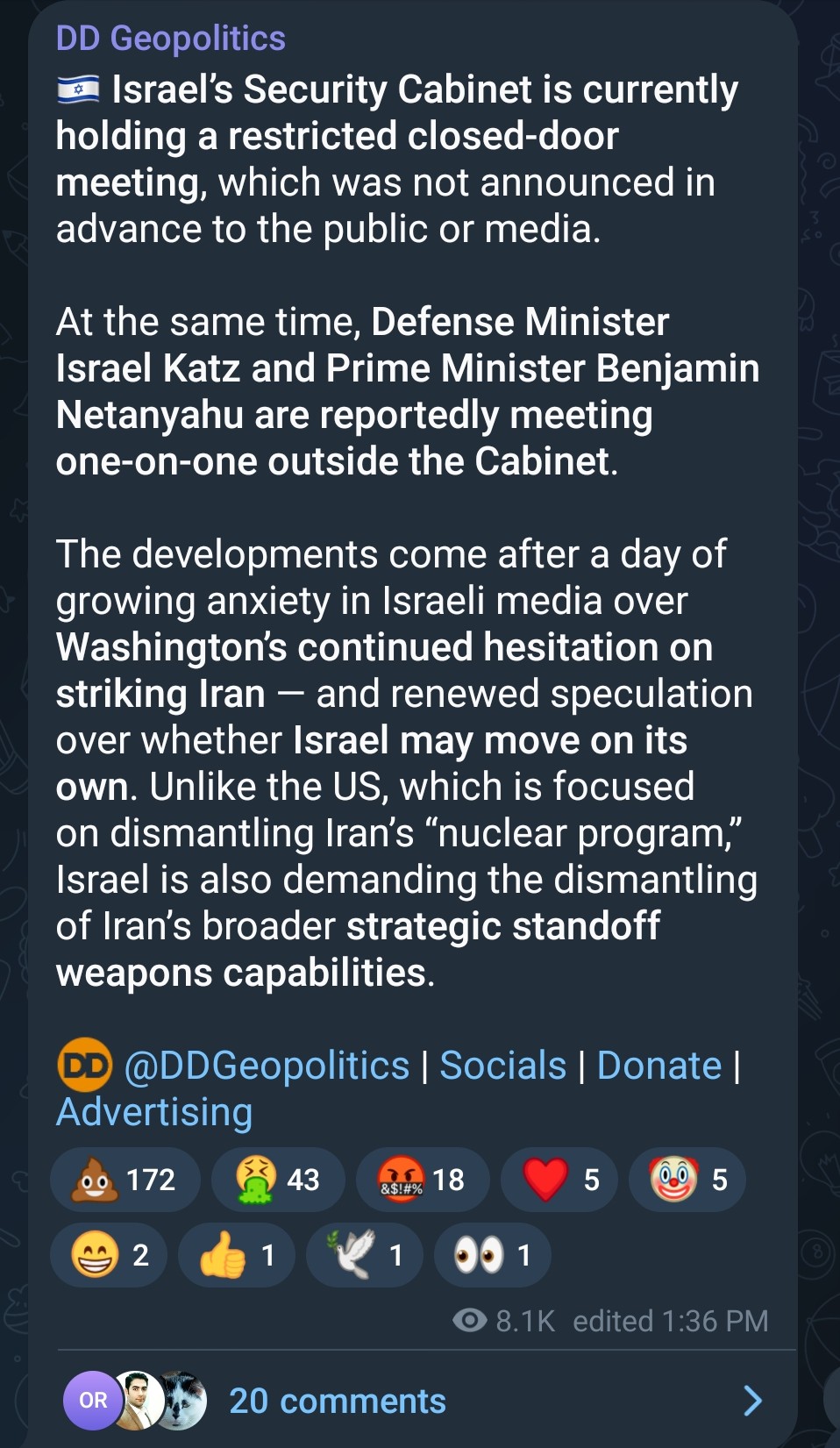 Frustated that the blackmail didn't work, Israel is considering attacking Iran on it's own.