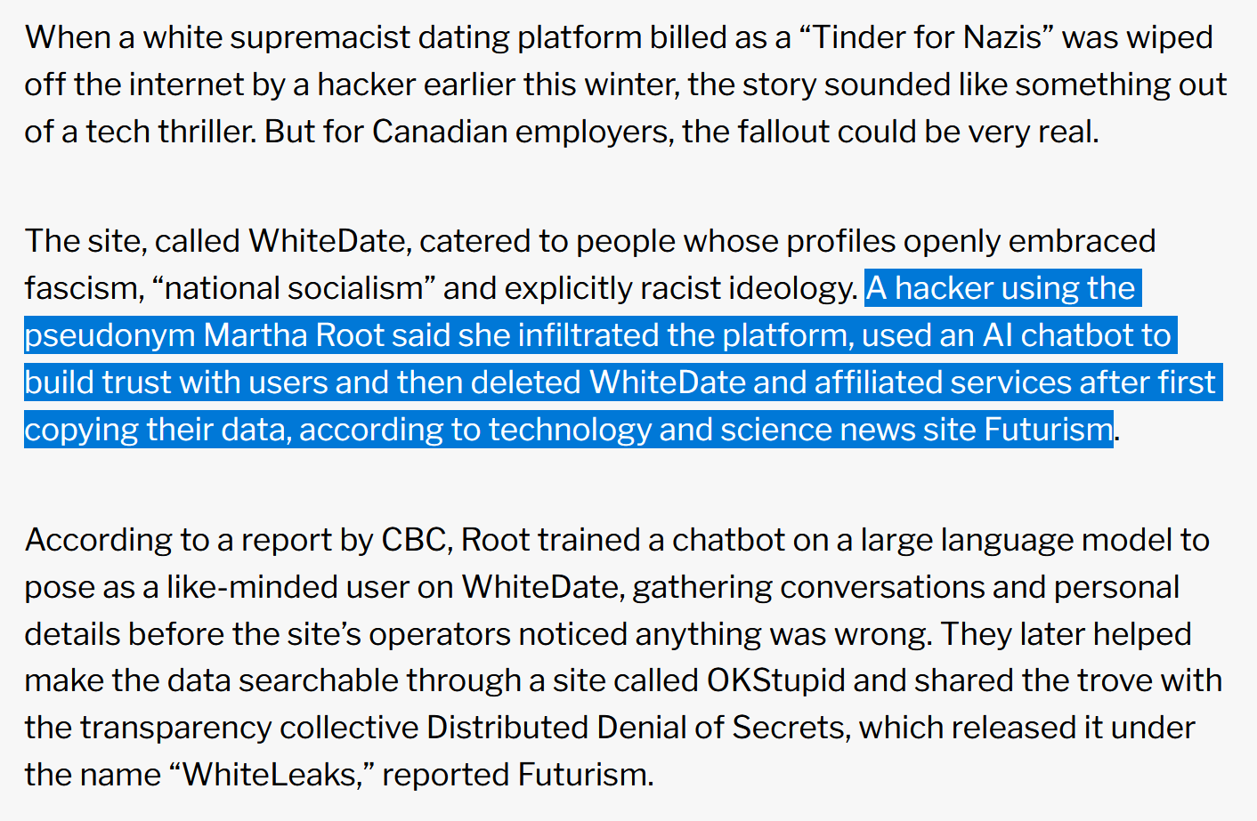 I have just been made aware of a """""hack""""" on a "White Supremacist" dating sate called WhiteDate earlier this winter. The """"""""""""""hack"""""""""""""" was a user creating an account, using an AI chatbot to talk to people and compile their data into a database so I would like to remind all of you if you get weird messages on here to contact us immediately since currently you can't report messages in chats